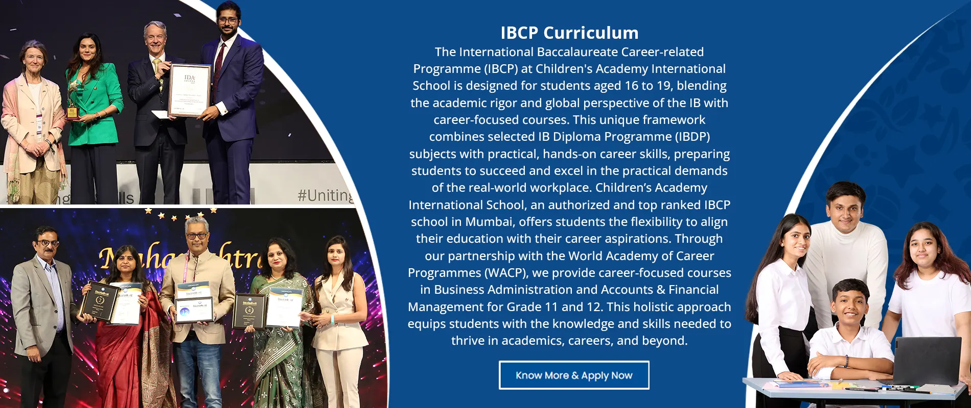 The International Baccalaureate Career-related Programme (IBCP) at Children's Academy International School is designed for students aged 16 to 19, blending the academic rigor and global perspective of the IB with career-focused courses. This unique framework combines selected IB Diploma Programme (IBDP) subjects with practical, hands-on career skills, preparing students to succeed and excel in the practical demands of the real-world workplace. Children’s Academy International School, an authorized and top ranked IBCP school in Mumbai, offers students the flexibility to align their education with their career aspirations. Through our partnership with the World Academy of Career Programmes (WACP), we provide career-focused courses in Business Administration and Accounts & Financial Management for Grade 11 and 12. This holistic approach equips students with the knowledge and skills needed to thrive in academics, careers, and beyond.
